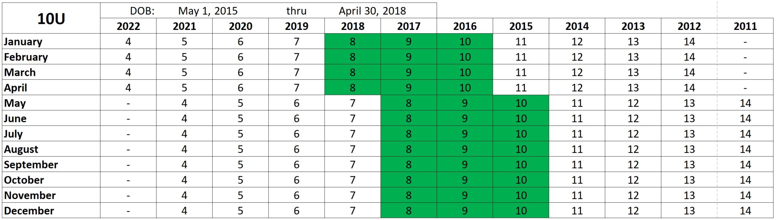Players must be 10 or under on May 1. Players who turn 11 prior to May 1 of the current season are not eligible.
