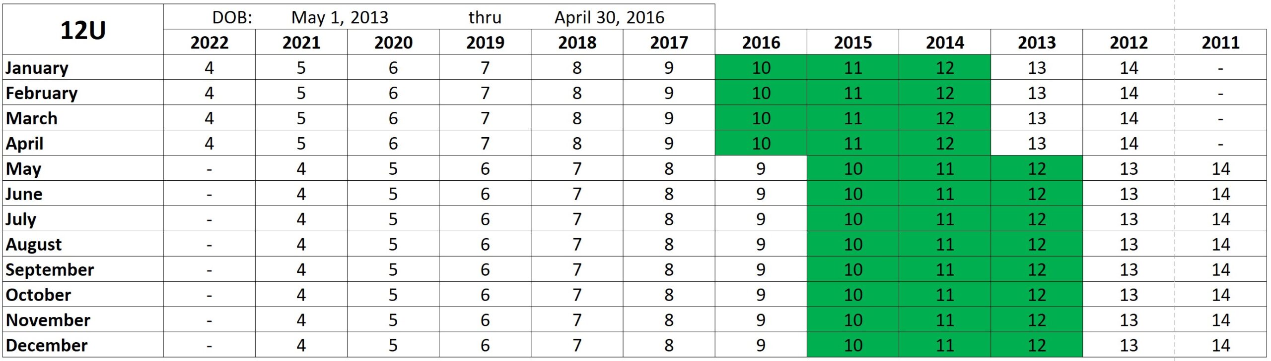 Players must be 12 or under on May 1. Players who turn 13 prior to May 1 of the current season are not eligible.